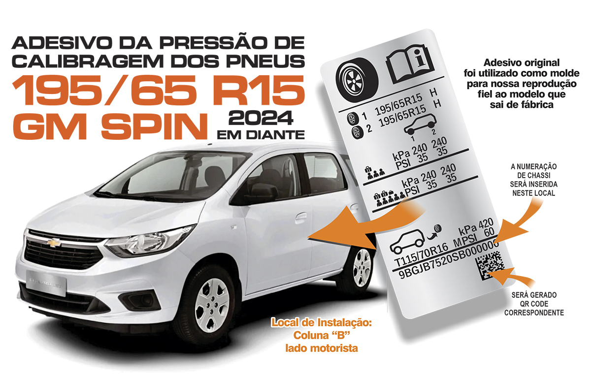 ETIQUETA DA PRESSÃO DE CALIBRAGEM DOS PNEUS P/ CHEVROLET SPIN EQUIPADO DE FÁBRICA COM PNEUS DA MEDIDA 195/65 R15 A PARTIR DO MOD. 2024