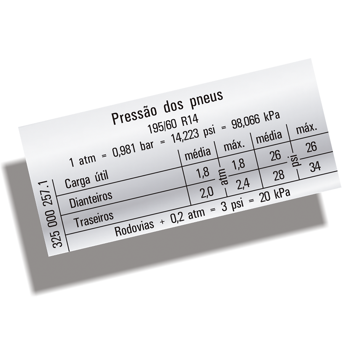 ETIQUETA METALIZADA AUTO-ADESIVA DA PRESSÃO DE CALIBRAGEM DOS PNEUS VW SANTANA E QUANTUM EQUIPADO COM PNEUS DA MEDIDA 195/60 R14