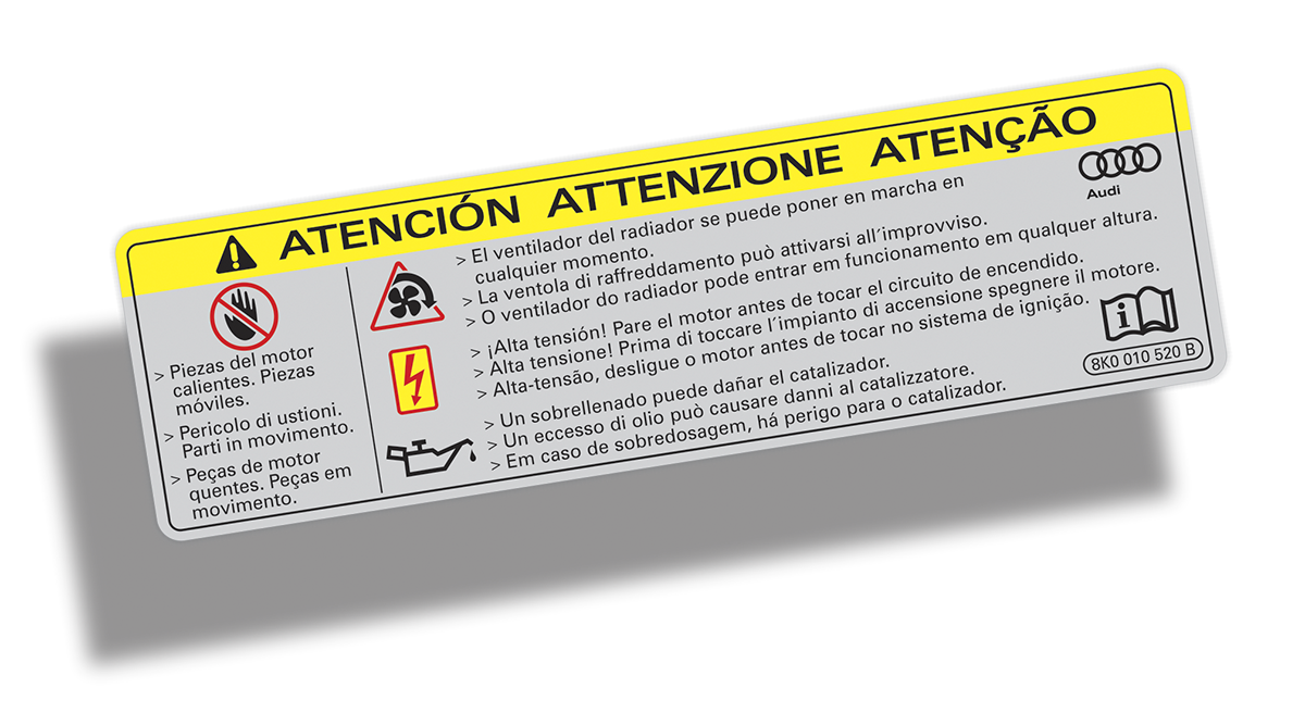 ETIQUETA ADESIVA COM ADVERTÊNCIA PARA PERIGO DA VENTOINHA, ALTA VOLTAGEM E PARTES QUENTES NO MOTOR PARA VEÍCULOS AUDI